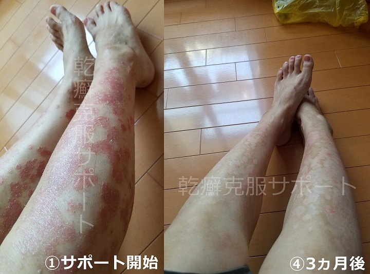 始めて二ヶ月位はあまり変わらない状態でしたが、徐々に痒みがおさまるようになり、顔や手足の乾癬が薄くなり始めました。
